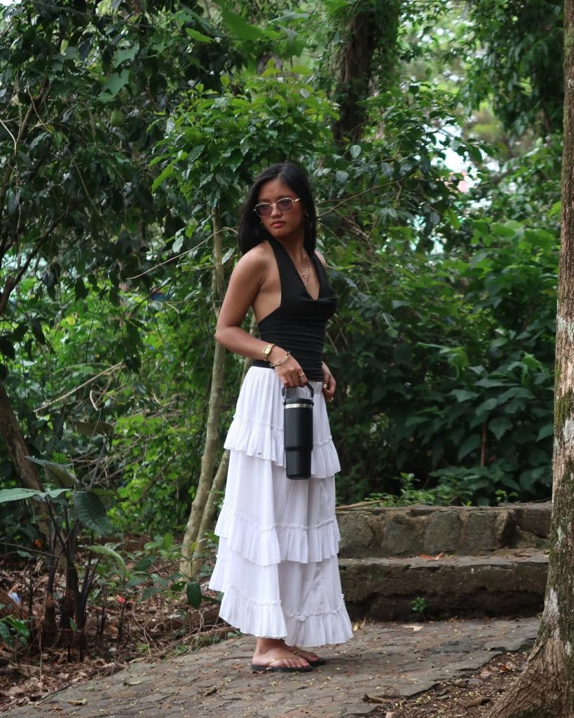 The tiered construction adds volume and movement, giving the outfit a carefree charm. It’s perfect for daytime activities—farmers markets, weekend brunch, or relaxed city walks.