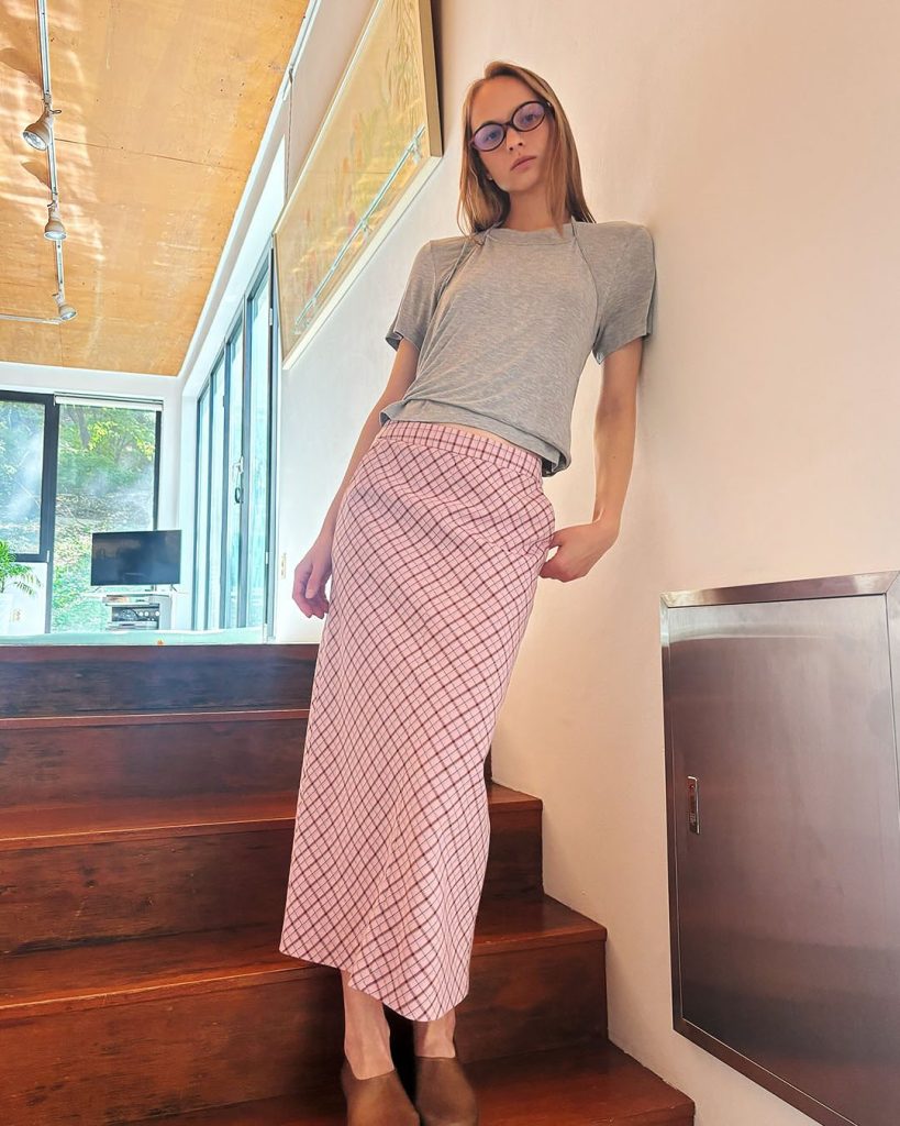 This look captures the effortless charm of modern street style. The structured Jean skirt provides a clean silhouette, while the soft knit top keeps the outfit light and approachable. It’s the kind of outfit that feels right for grabbing an iced coffee, browsing bookstores, or strolling through sunny neighborhood streets.