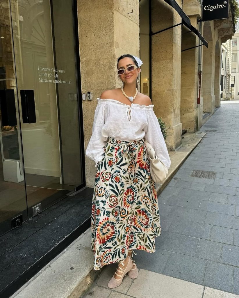 This outfit captures the spirit of coastal towns and warm afternoon walks through sunlit streets. The skirt’s pattern leans into a light Floral and Boho mood, making it perfect for travel days, café hopping, or strolling through a seaside market.