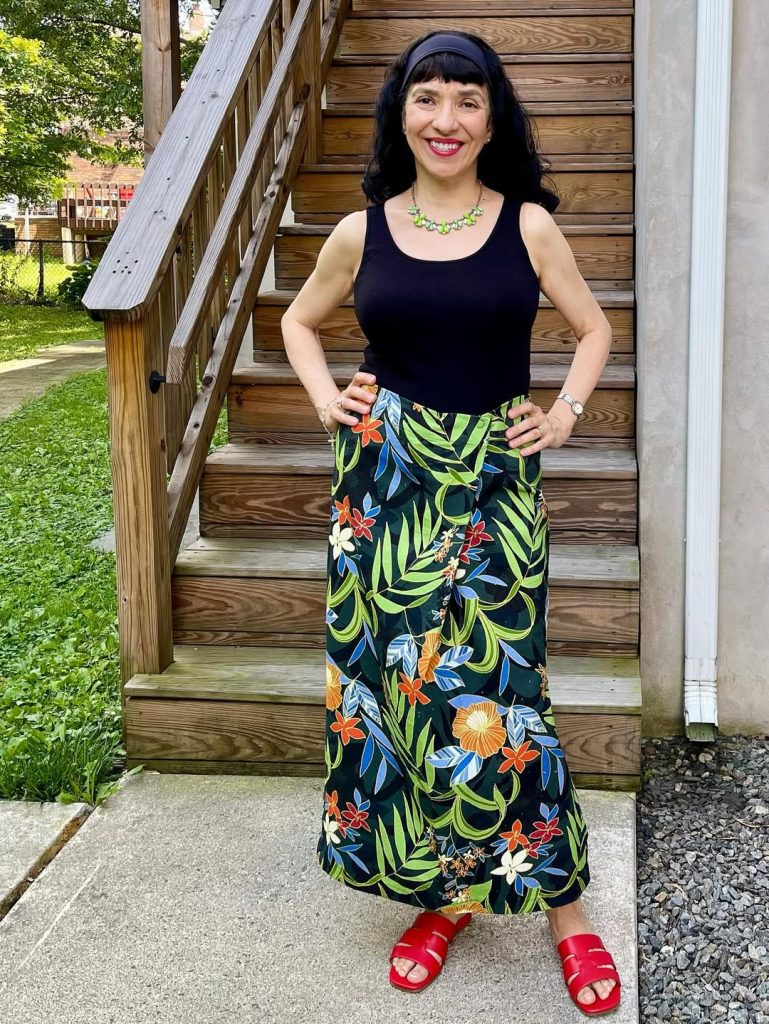 A vibrant tropical Floral Maxi skirt paired with a simple black tank creates a lively summer outfit full of personality.