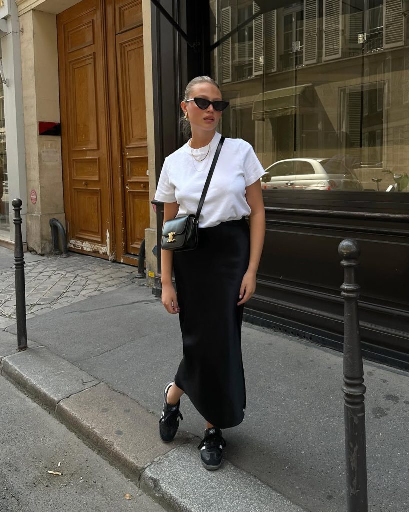 A sleek black satin skirt, paired with a crisp white tee, delivers understated elegance that echoes classic European street style.