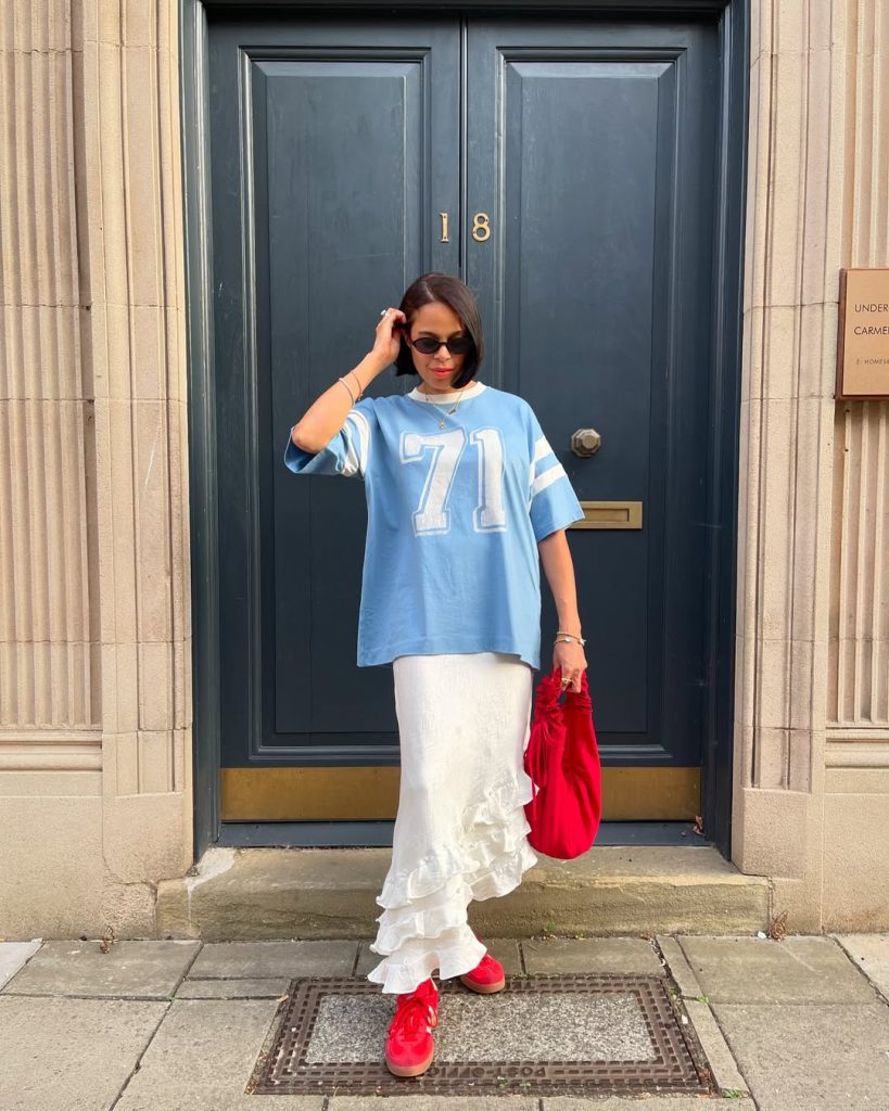 A flowing White maxi skirt paired with an oversized graphic tee creates a modern sporty outfit that blends comfort with bold streetwear.