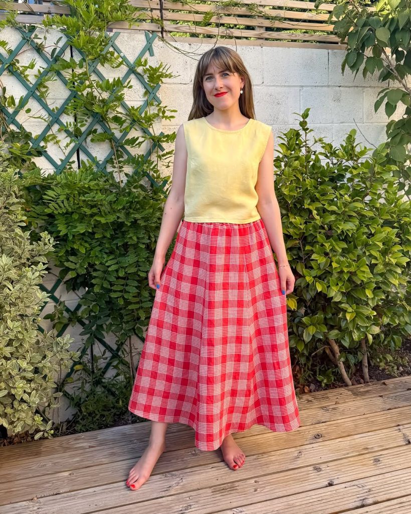 A cheerful Plaid Maxi skirt in vibrant red paired with a soft yellow sleeveless top creates a playful and refreshing summer look.