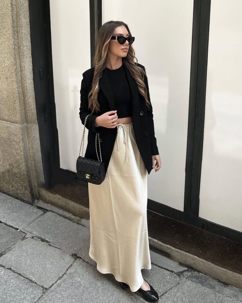 A flowing White Maxi skirt paired with a structured black blouse creates a timeless outfit that feels refined yet effortless.