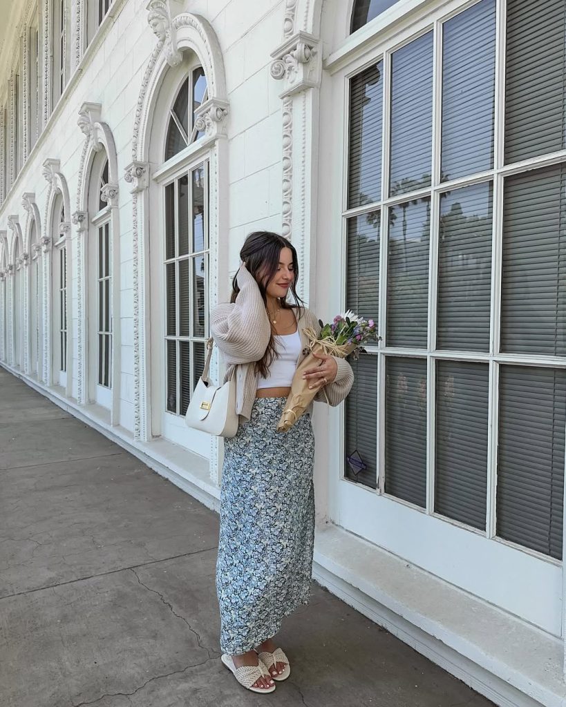 A delicate Floral Maxi skirt paired with a cozy knit Cardigan creates a romantic, easygoing summer outfit perfect for relaxed daytime outings.