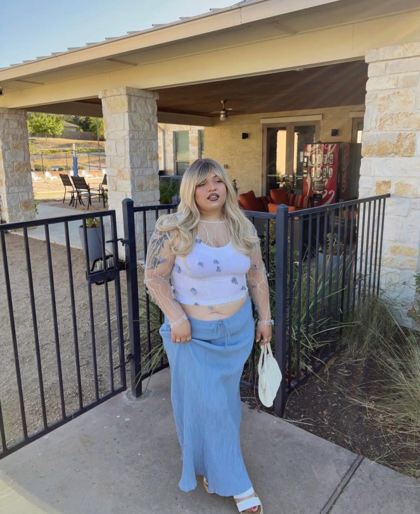 A pale Blue skirt paired with a sheer, embellished top offers a graceful balance between delicate textures and relaxed summer comfort.