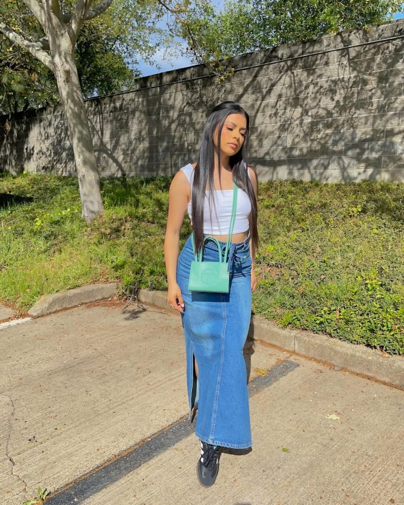 A long Denim skirt paired with a cropped tank delivers a confident streetwear look that blends comfort with a bold summer attitude.