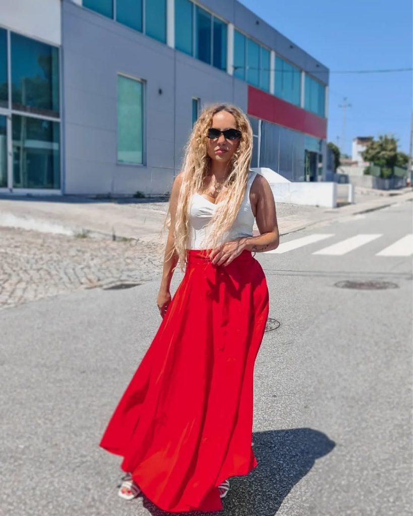 A vibrant red Maxi skirt paired with a fitted white top creates a bold, confident summer look that immediately draws attention.