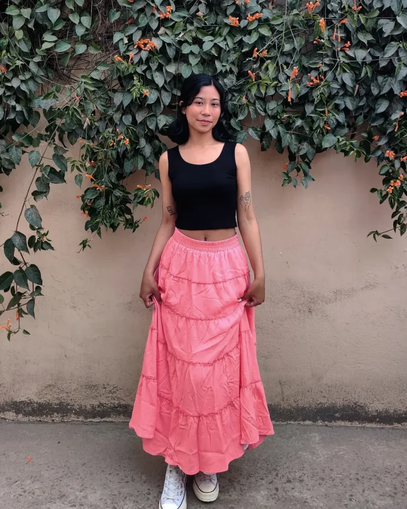 A playful tiered Maxi skirt in soft pink paired with a cropped black top creates a relaxed yet trendy everyday outfit.