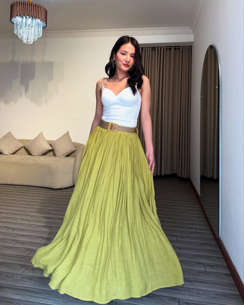 A pleated lime-green Maxi skirt paired with a sleek white top creates a refined, graceful summer silhouette.