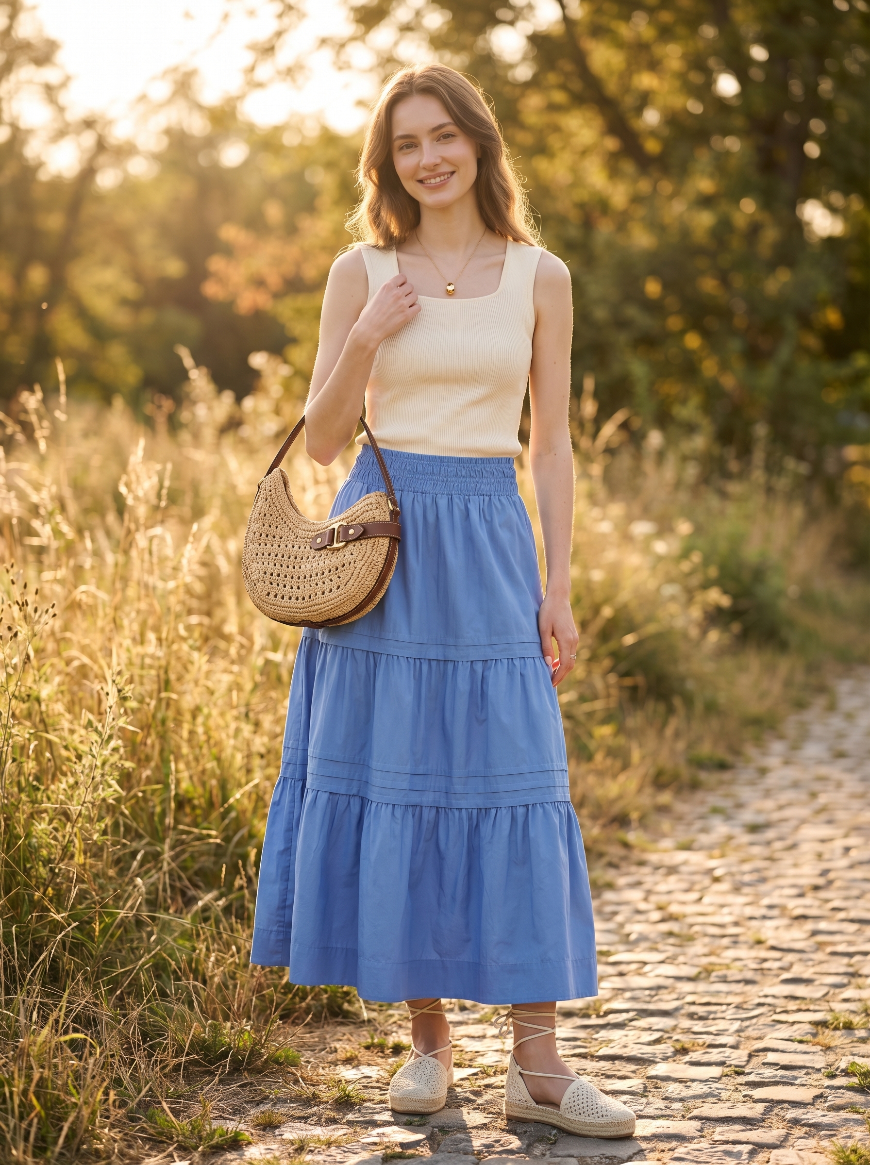 Sleek and sophisticated. This Coastal Charm Brunch look features a Quince Women’s Organic Cotton Poplin Tiered Maxi Skirt in sky blue for $59.90, paired with a cream GU USA Women’s Ribbed Knitted Square Neck Tank Top at $19.90. The Ralph Lauren Women’s Tasha Woven Straw Crossbody Bag, $295, and ALDO Shoes Women’s Picot shoes in natural jute, $49.97, complete the summery vibe. The ribbed knit is advertised to maintain its shape after a full day of wear at the beach, but if you prefer a looser fit, skip this one; it hugs the body.