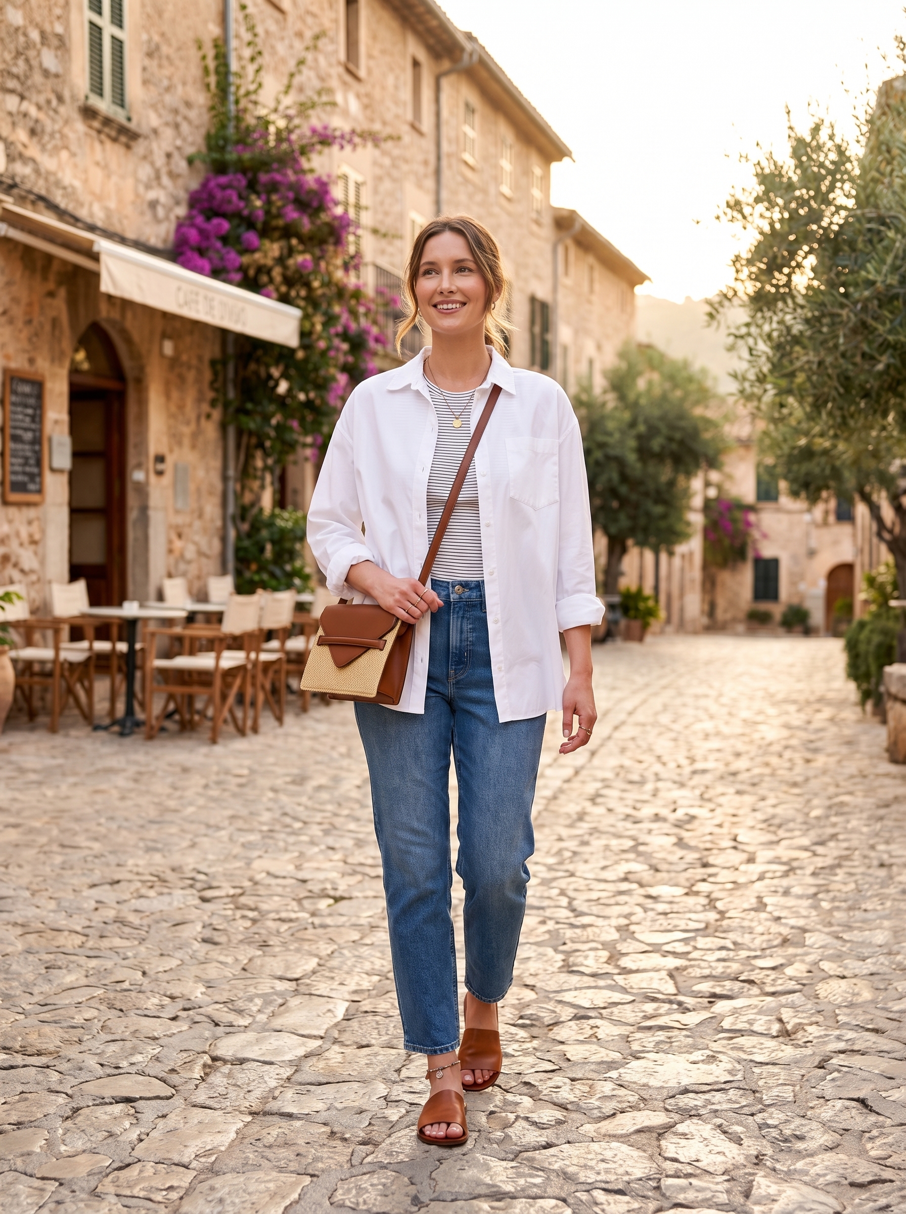 A basic for a reason. This ensemble for a Coastal Charm Brunch uses an Old Navy Women’s Oversized Button-Down Boyfriend Shirt in crisp white cotton poplin for $23.99, paired with what appears to be high-waisted tailored linen shorts in navy blue. The Free People Women’s Vicente Leather Slide Sandals in tan, at $78, add a relaxed touch, while the Tuckernuck Raffia Stevie Crossbody bag, $128, provides texture. This shirt will indeed look effortlessly chic tucked into jeans for a casual brunch; it’s practically its raison d’être. Effortless, every time.