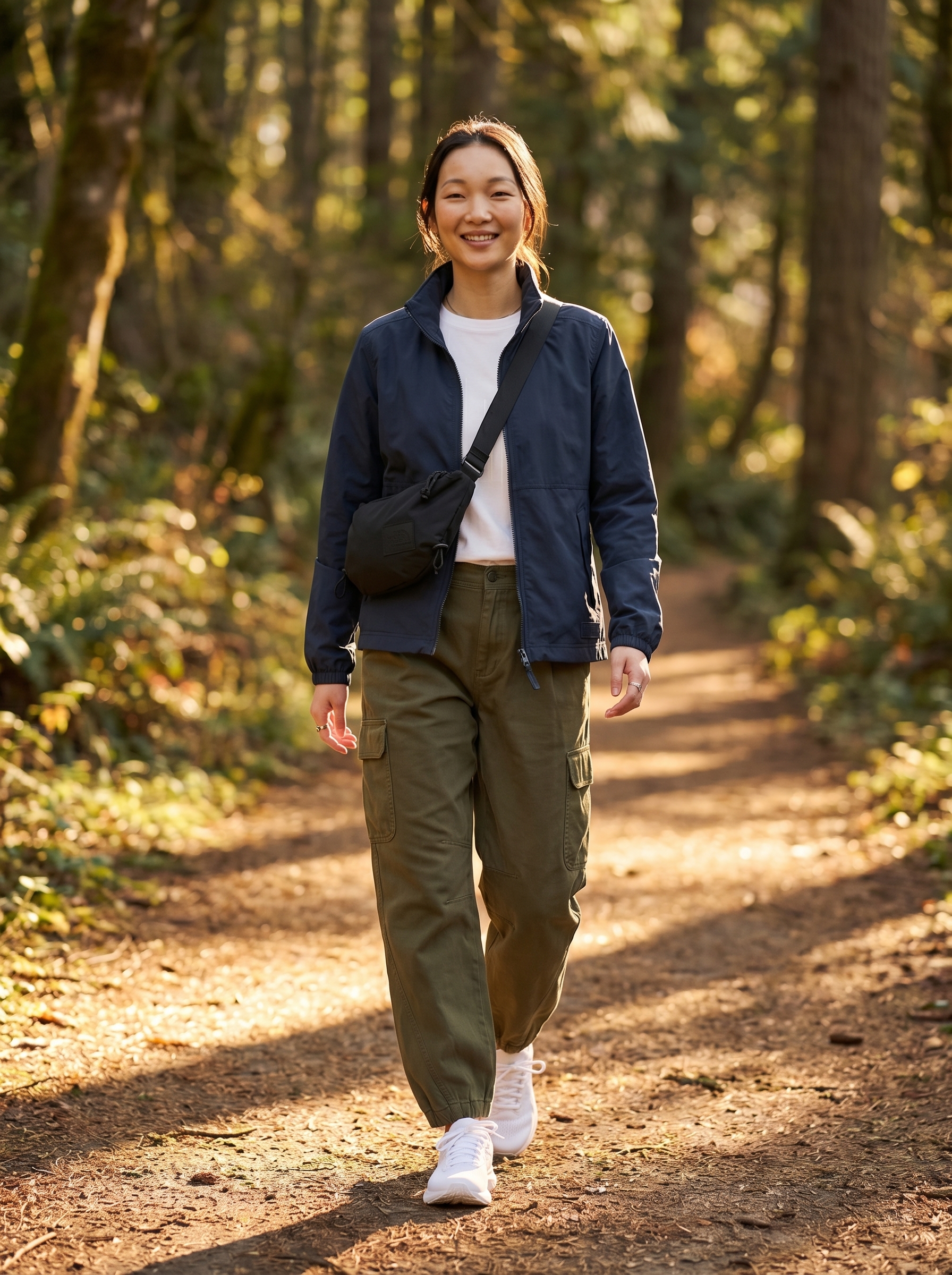 This Old Navy Women’s Twill Barrel Cargo Pants in khaki green, priced at $30, sets a practical tone for a lighthouse tour, complemented by a simple white, 100% cotton top from American Eagle Outfitters for $9.99. The navy blue L.L.Bean outerwear, at $57.79, provides protection from unpredictable coastal breezes, while the white ASICS shoes, at $64.95 and made of mesh and rubber, are essential for comfortable walking over varied terrain.