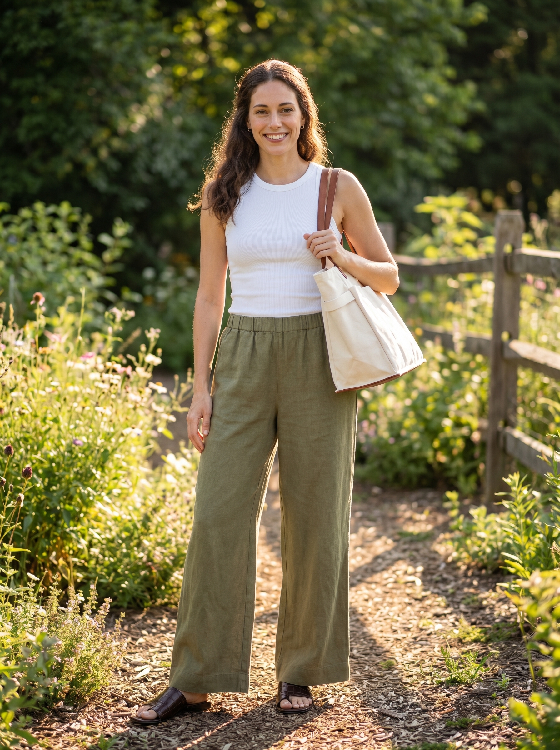 These Old Navy linen-blend super wide-leg pants in olive green, $28, offer a breezy fit that’s ideal for lingering through a morning market. Paired with a white cotton blend top for $8, this outfit keeps things refreshingly simple. The dark brown leather slide shoes, $118, however, really ground the look, adding an unexpected touch of luxury to an otherwise budget-friendly ensemble. I found the cotton blend tank comfortable on a brisk morning walk, but it does show sweat marks rather easily. Not for testing your personal thermostat.