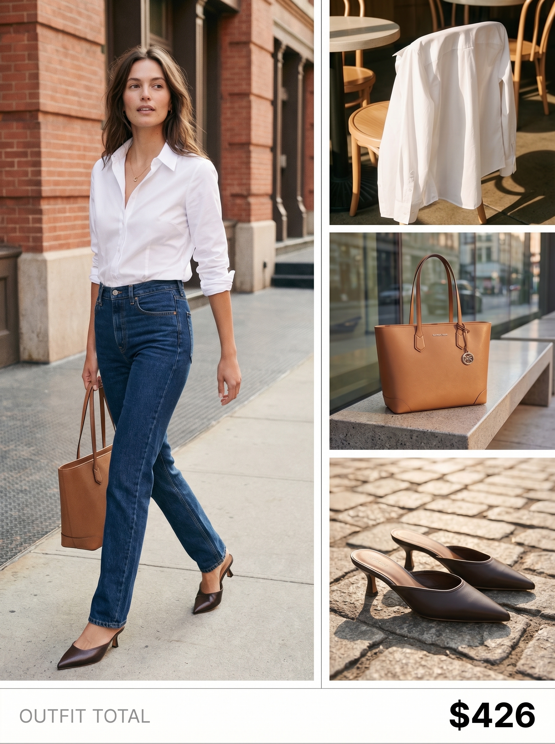 Denim, but elevated. This ‘City Slicker Summer’ look, a cohesive blend of dark wash denim, crisp white, and warm tan, comes in at $426. I’m looking at Abercrombie & Fitch jeans ($90) that held their shape over 8 hours of city walking—no mean feat. Paired with a classic white cotton poplin Banana Republic Factory top ($48), the overall effect is polished and modern. The neutral tan Quince Italian Leather Kitten Heel Mules ($84) and a Michael Kors Saffiano Leather Tote Bag ($139) round out the elevated casual vibe. That top, by the way, is easy care. This is for the woman who needs her look to perform, not just pose.