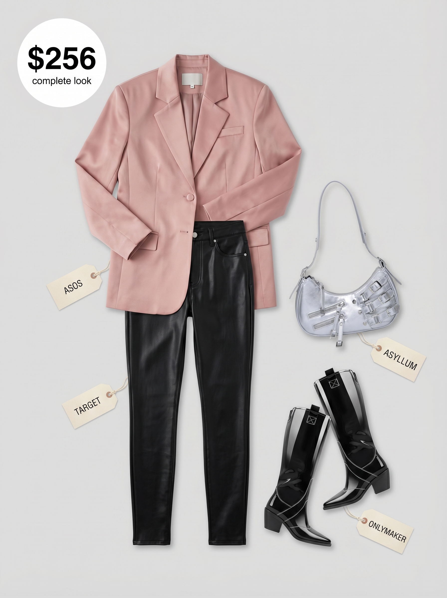 For an outfit totaling $256.14, I’m eyeing this ‘Rodeo Queen Ready’ look, which features an oversized dusty pink ASOS Design Tailored Satin Blazer over sleek black faux leather pants. I find the visual juxtaposition compelling—the soft, muted pink of the blazer against the bold, shiny black of the patent cowboy boots, which appear to have chain detailing, really elevates the look. A shimmering silver shoulder bag adds to the evening glamour. This isn’t for the faint of heart or for those who prefer to blend in. The sequined mesh top suggests a party outfit, perhaps a concert or a themed bash.