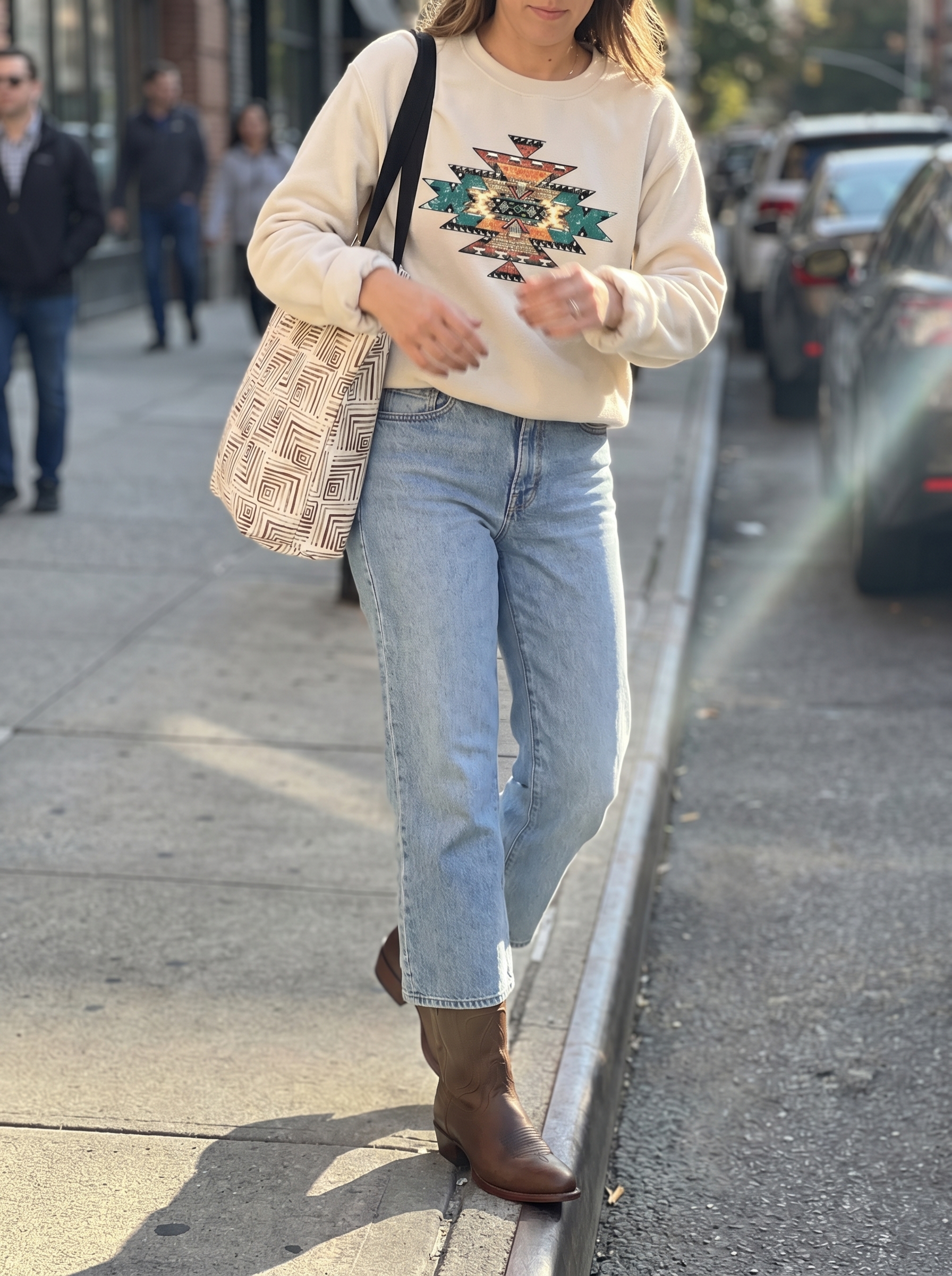 This cream cotton fleece sweatshirt featuring a rust and navy print, priced at $34.04 from Etsy, was indeed warm enough for a campfire evening with temperatures reaching 50°F. I appreciate that a budget-friendly piece can deliver on such claims. The comfortable, relaxed-fit medium wash denim jeans from Nordstrom at $129 pair nicely with the dark brown genuine leather Tecovas Men’s The Cartwright Scotch Boots are an investment at $375 that anchors the entire southwestern vibe. A $12.50 natural canvas tote bag with a brown geometric print completes the look—convenient for stuffing s’mores ingredients. If you appreciate a more tailored aesthetic, you should probably skip this one entirely.