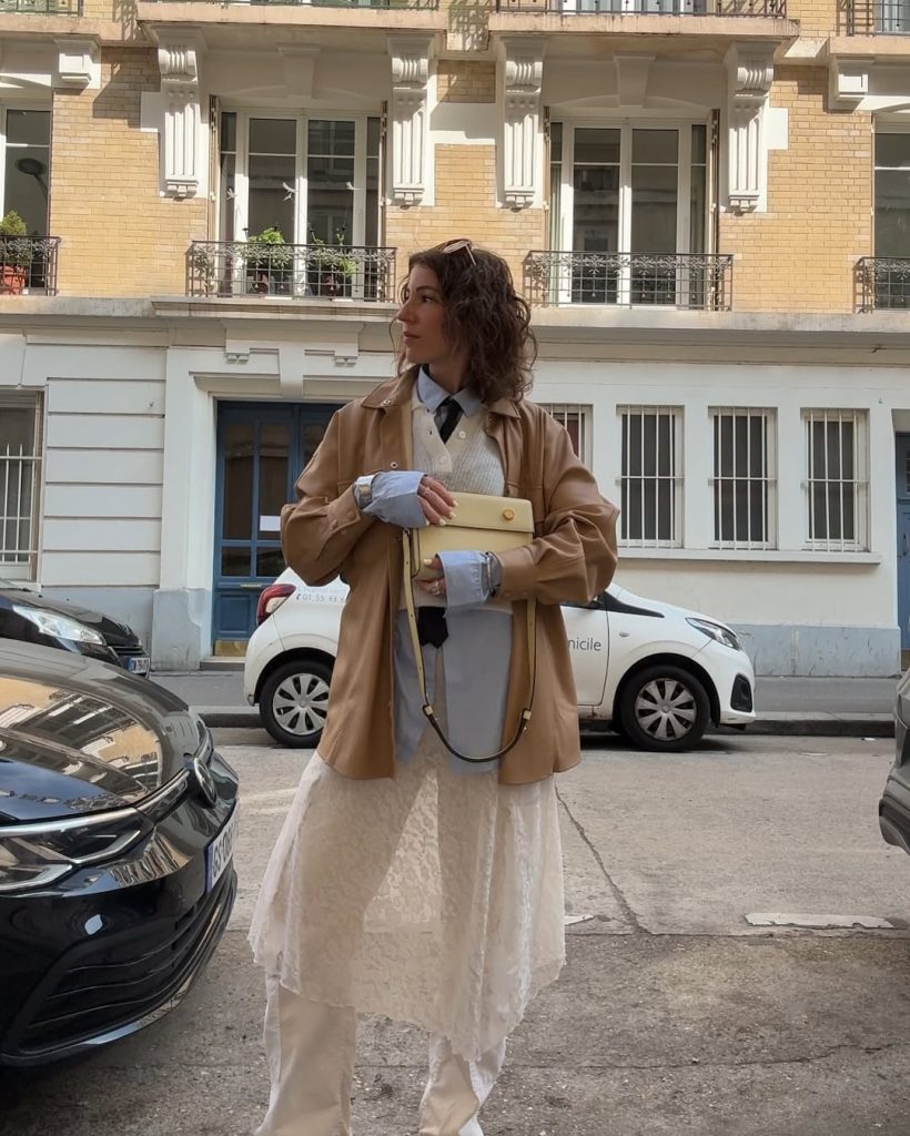 Soft neutrals and delicate lace create a romantic layered look for mild spring days.