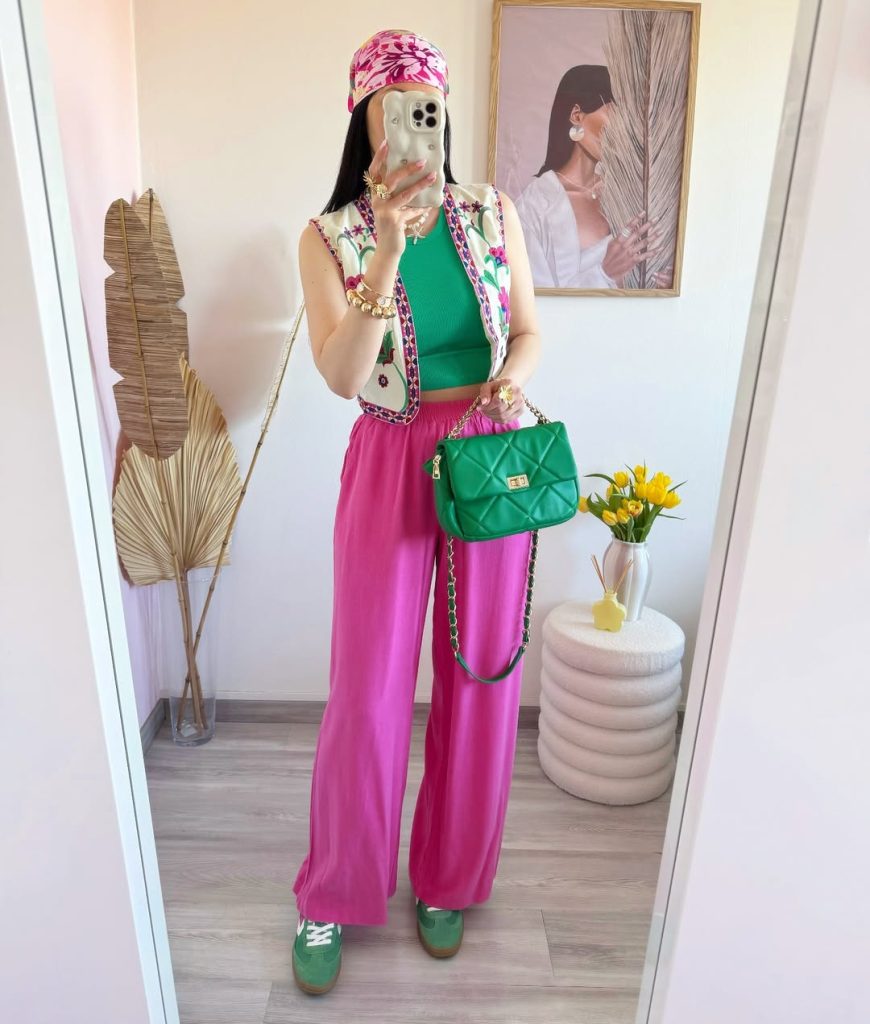 Bright pink trousers and a green top bring fearless color to spring layering.