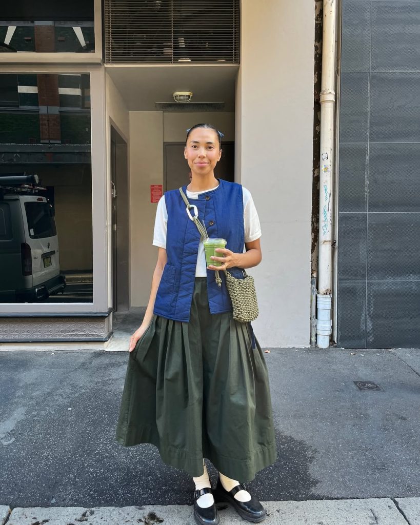 A quilted vest over a full midi Skirt blends practicality with quiet elegance.