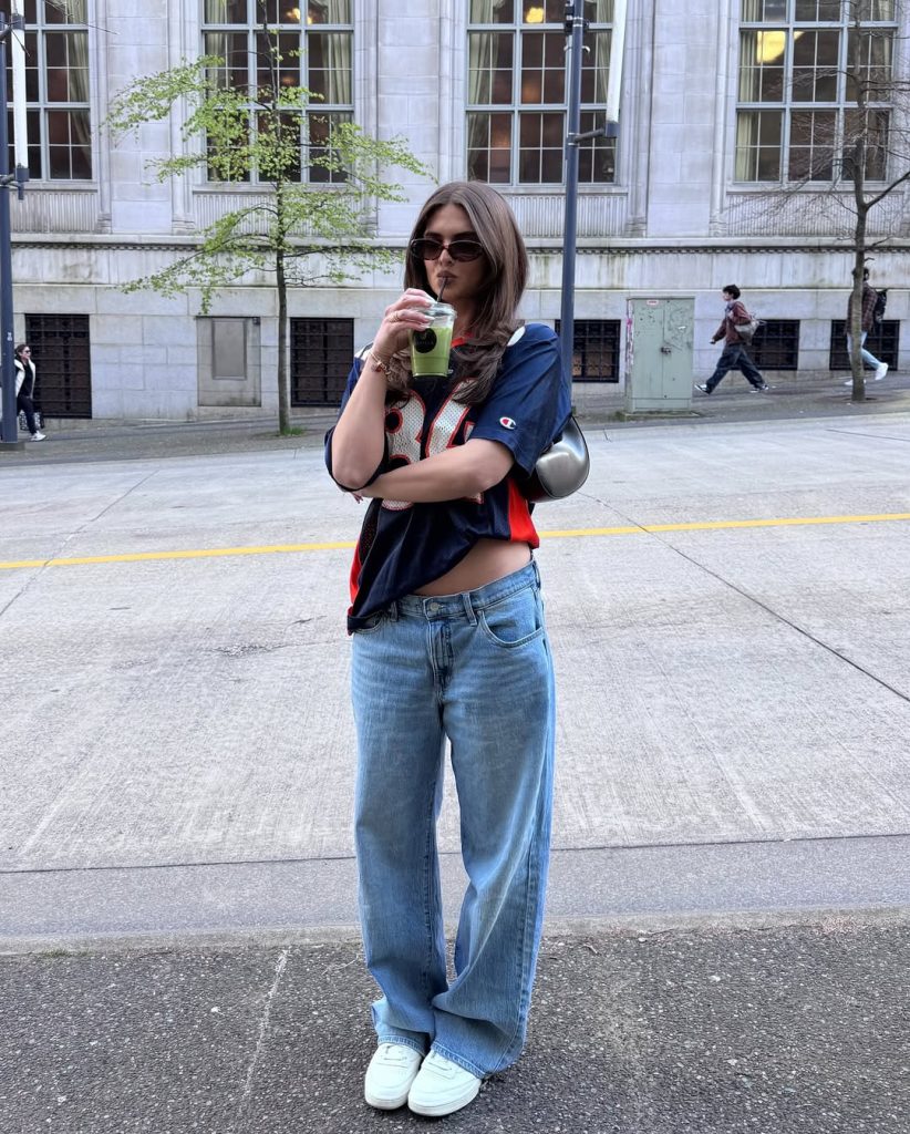 This outfit captures effortless street energy—perfect for a casual day out, campus walks, or grabbing matcha on the go. The loose jersey balances the structured denim, making it ideal for Athletic-inspired styling without looking gym-ready.