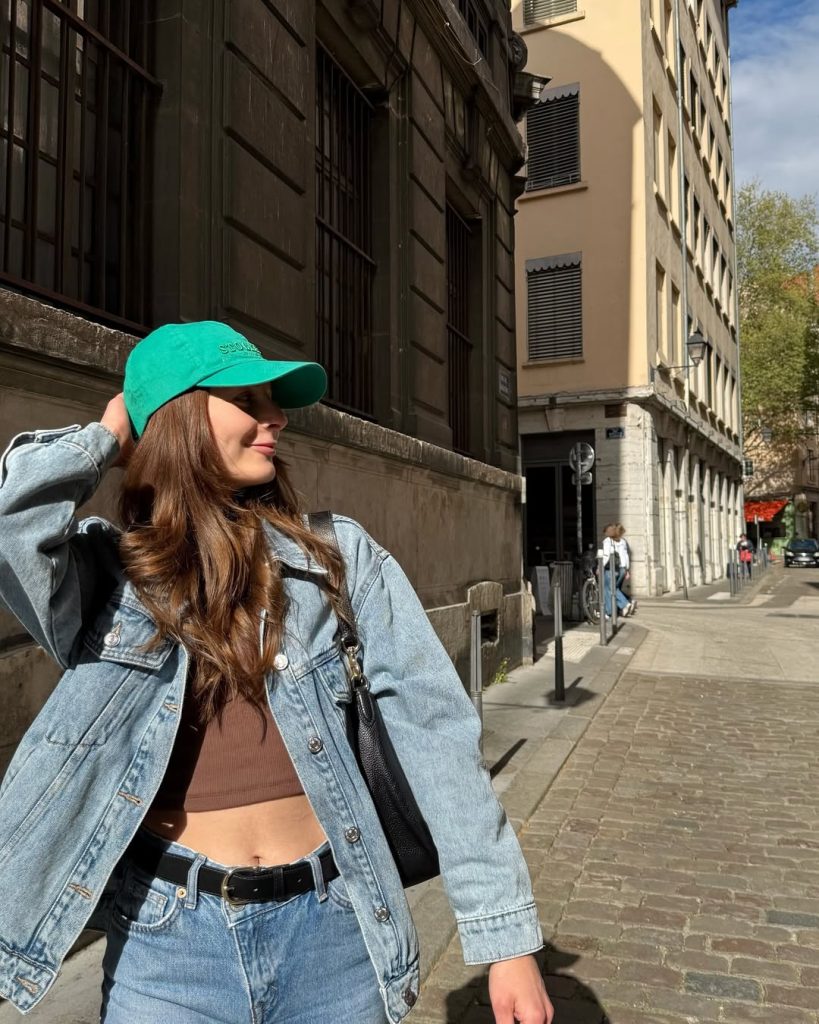 There’s something undeniably effortless about double denim in 60-degree weather. The jacket provides just enough warmth for breezy mornings, while the fitted crop top keeps the look balanced and modern. The green cap adds a playful, Athletic touch—perfect for weekend strolls, casual errands, or a relaxed coffee run.