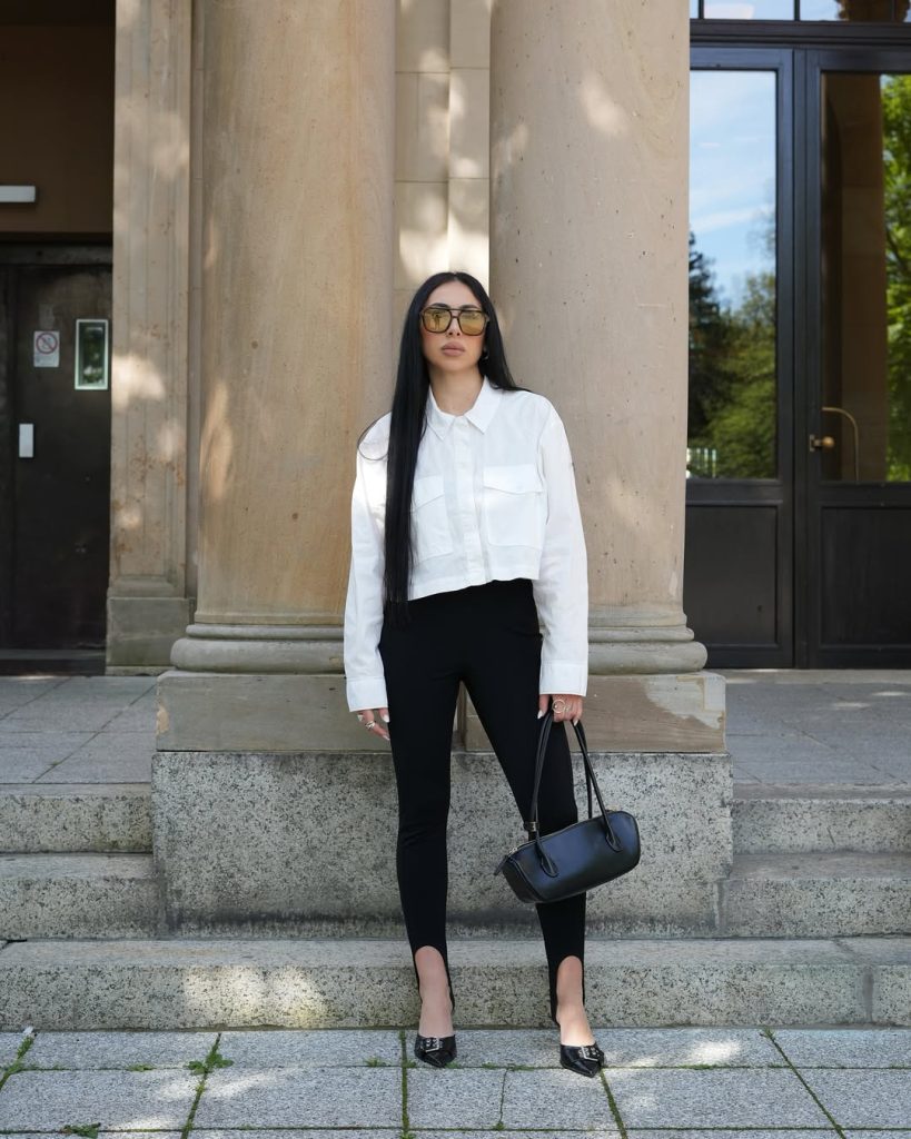 A cropped white shirt and sleek black trousers create modern city simplicity.