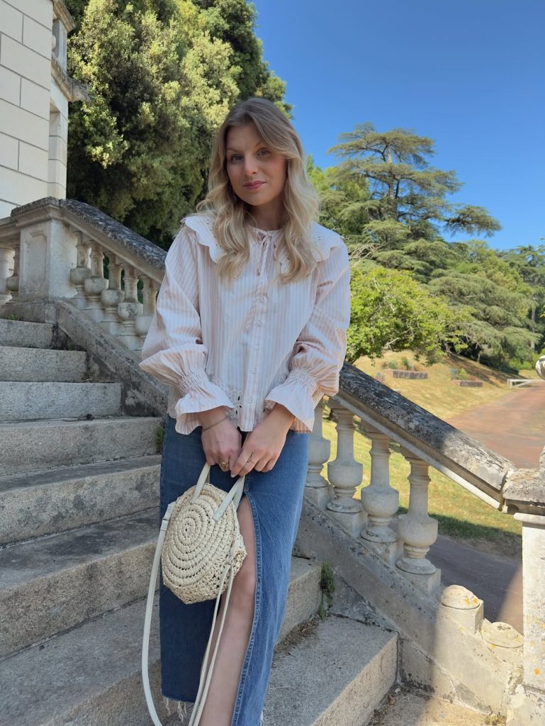 A soft blush blouse pairs beautifully with a denim midi skirt for spring romance.