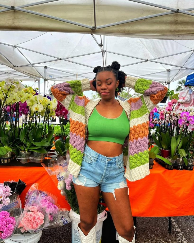 A colorful knit cardigan over a green crop top offers relaxed spring charm.