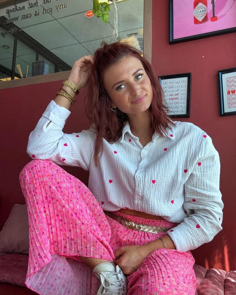 A heart-detailed blouse meets a flowing pink skirt for a Cute, statement-ready look.
