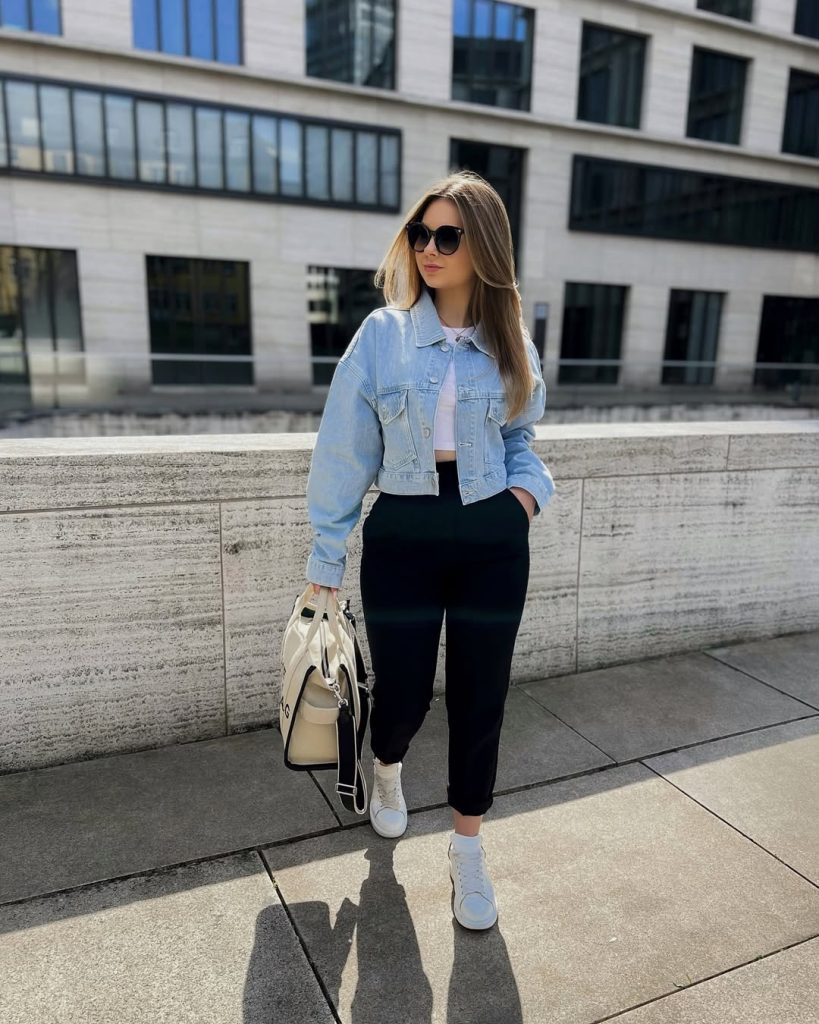 This look proves that 60-degree layering can feel intentional. The cropped denim jacket softens the clean lines of the trousers, making it perfect for transitional spring mornings in Nyc or urban commutes. It’s polished enough for relaxed Work settings and approachable enough for a stylish School meeting.