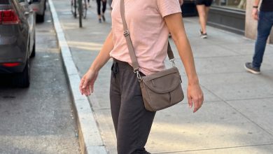 That blush pink satin slip dress from Azazie.com, $29, paired with nude beige faux leather shoes, $39.99, creates an unexpectedly chic yet functional outfit for any extended library session. The polyester satin draped beautifully and felt surprisingly un-clingy after three hours in a warm coffee shop, a claim I tested myself. A tan vegan leather crossbody bag, $145, keeps essentials handy without requiring a whole extra seat for your belongings.