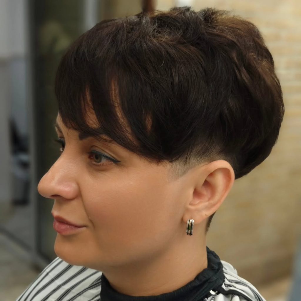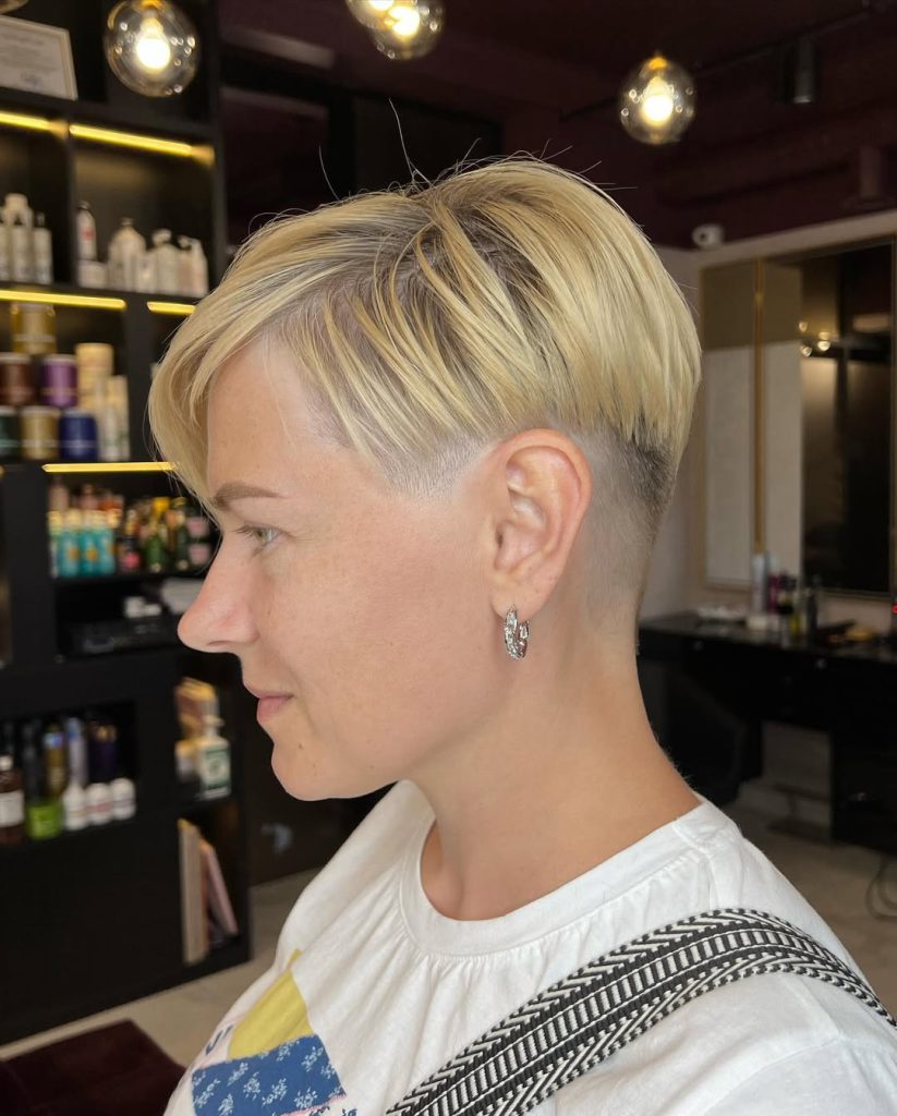 This short undercut pixie cut is all about contrast and confidence. The closely shaved sides create a clean, modern base, while the longer top Layers add softness and movement. It feels bold but still refined—like a perfect mix of edge and elegance that doesn’t try too hard to impress.
