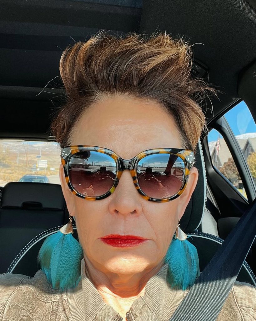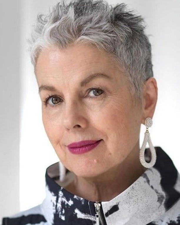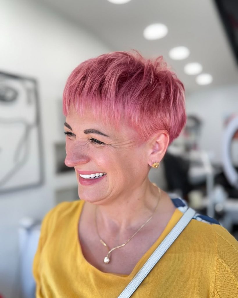 There’s something undeniably joyful about a bold splash of color, and this playful pink short pixie is proof that style has no age limit. The cropped cut, paired with the soft yet edgy fringe, radiates confidence and personality. It’s a hairstyle that doesn’t whisper—it sparkles, bringing out the inner vibrancy that women over 60 can wear so well.
