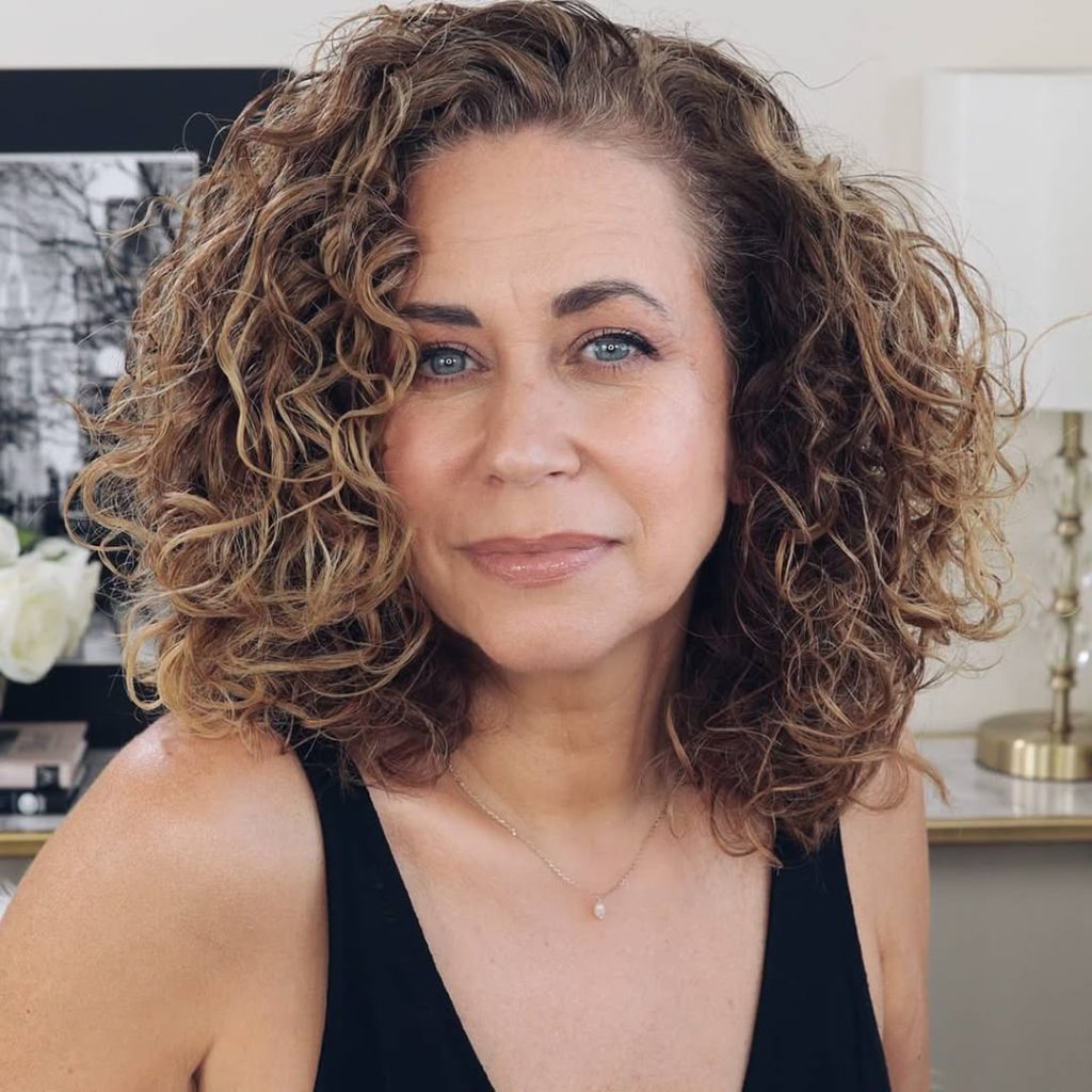 This curly shoulder-length hairstyle is full of body and charisma, and it celebrates the beauty of natural curls in the best possible way. The curls provide a softening feature, along with the youthful and free-spirited look, creating a fresh and outstanding look that’s modern and beautiful.