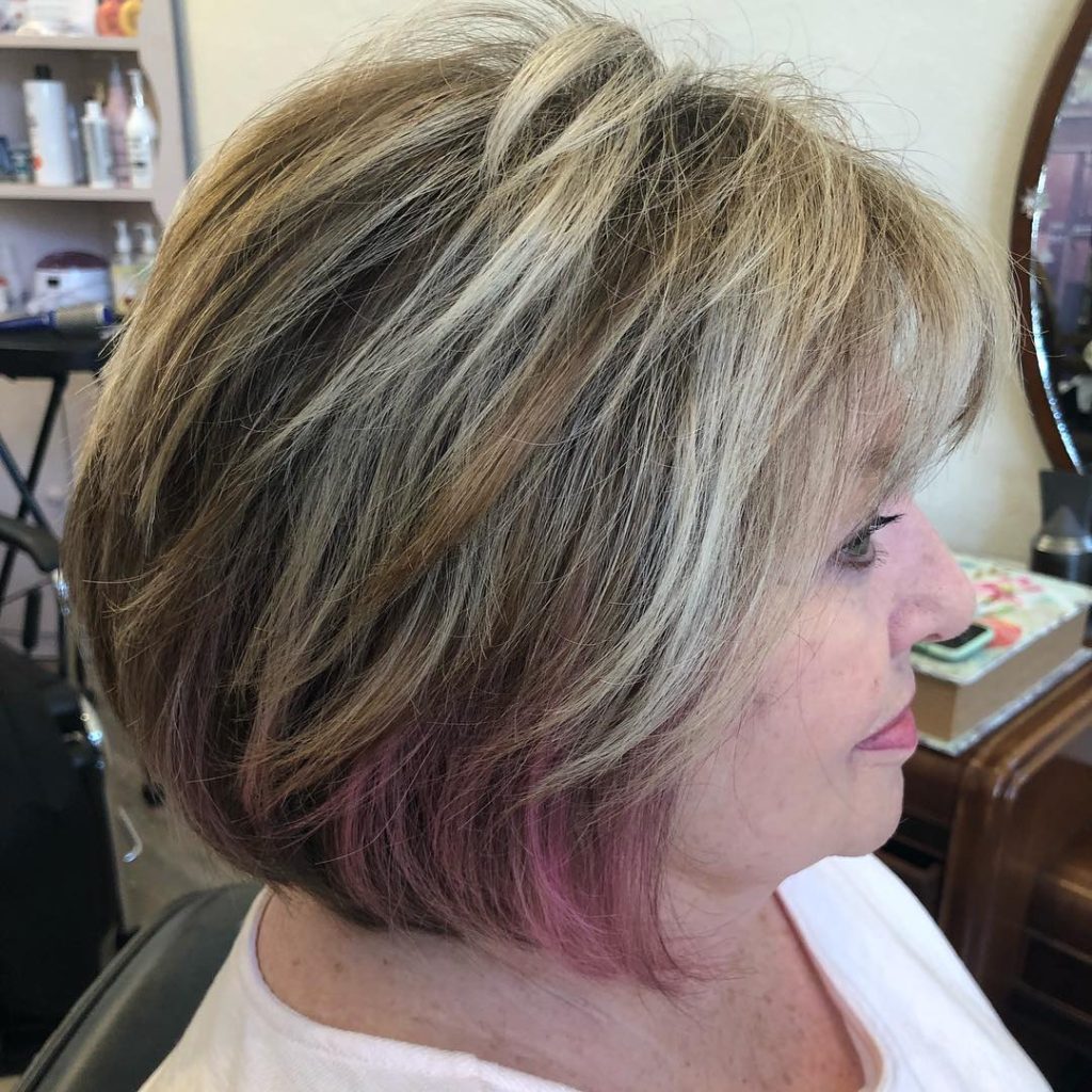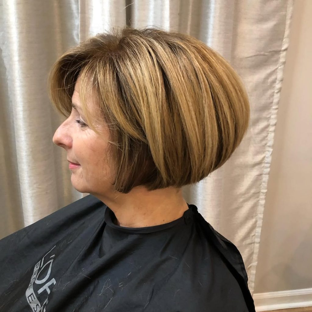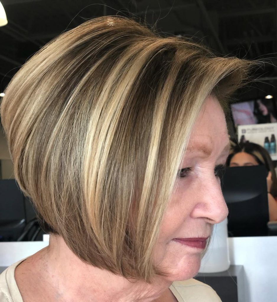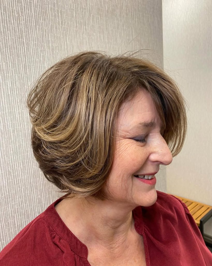 The classic wedge bob has made its way back into fashion, and it is absolutely stunning for women aged 60+. The stacked back, rounded shape, and added golden highlights provide a sleek look that is easy to pull off and is extremely fashionable.