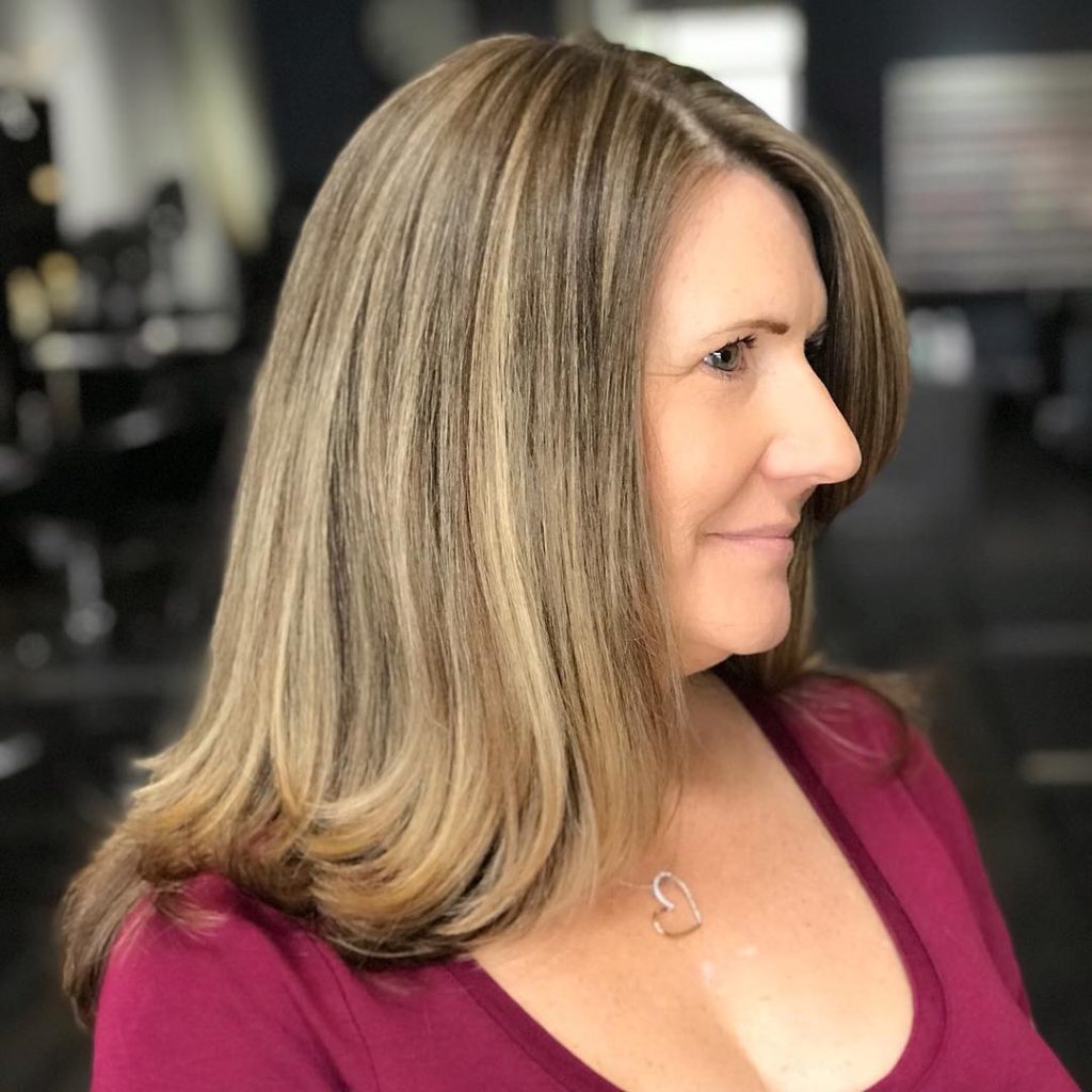 This sleek angled bob with highlights is ALL ABOUT polish. The sleek angles paired with the golden highlights produce dimension, shine, and a level of polish that does not cease to amaze. It’s classic, it’s chic, it’s universally flattering, and it will upgrade any look instantly.