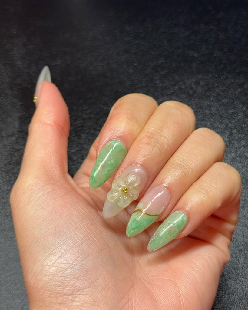 These jade almond nails have a soft, translucent green tone that mimics natural stone, exuding an elegant and spiritual feel. The subtle marble art adds a sense of serenity, while the single 3D flower with a golden bead at the center makes this look quietly luxurious yet playful—perfect for anyone drawn to both nature and artful beauty.