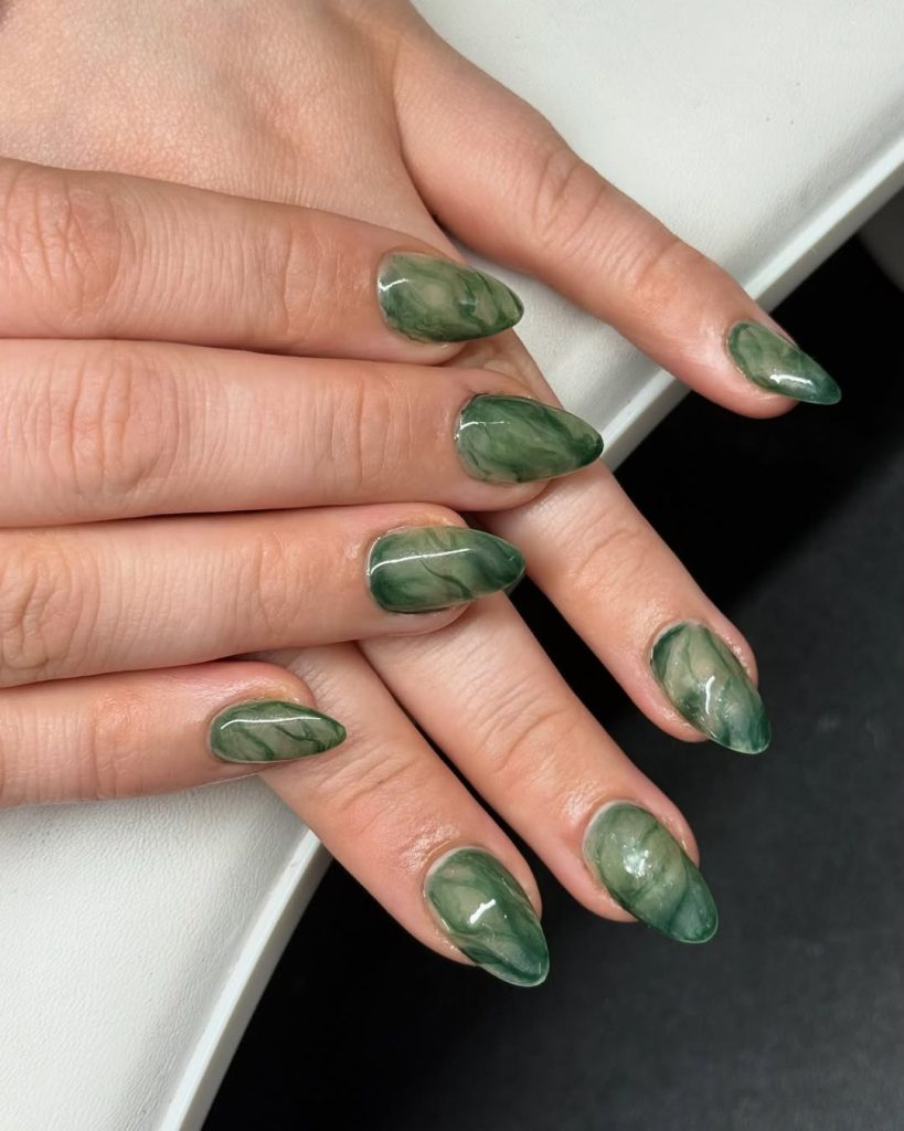 The dark green jade nails create a sense of depth and beauty, calling to mind polished stone softly illuminated. The layered marble effect creates depth to the surface, and the glossy soft gel top increases the richness. The mood of this design is confident, sensual, and slightly mysterious, echoing a modern interpretation of ancient beauty.