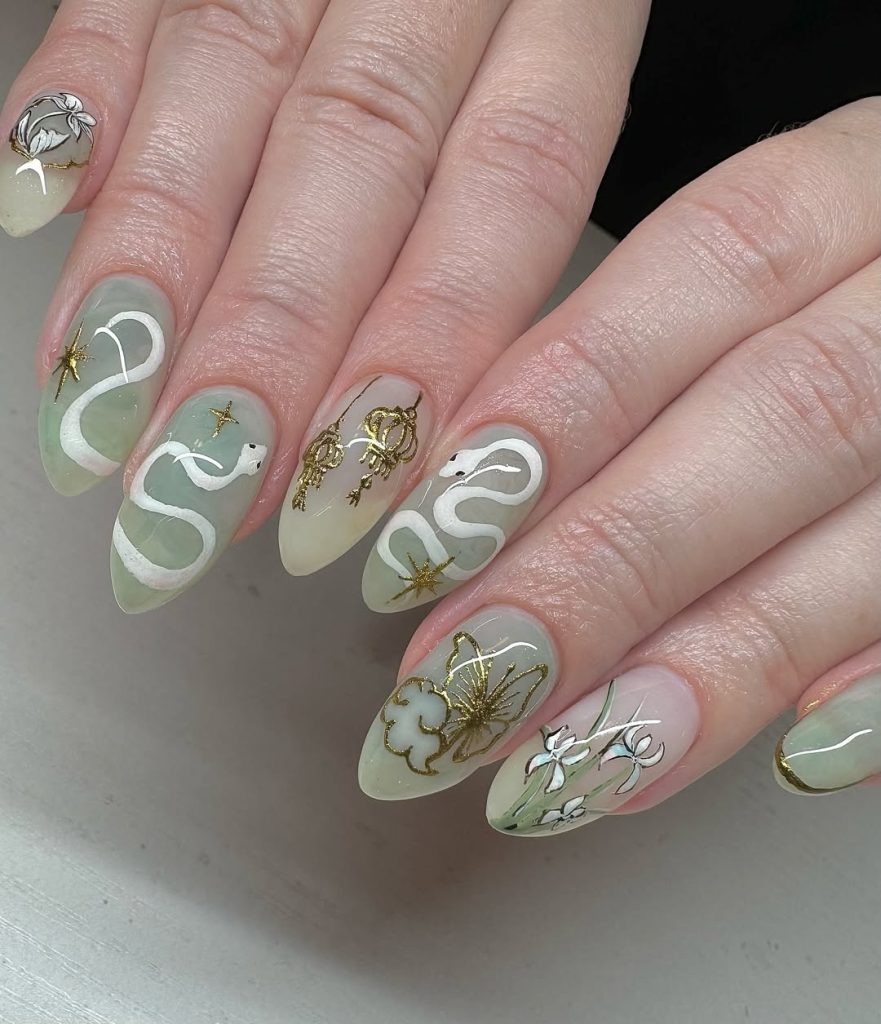 A true masterpiece for 2026, these jade nails blend soft translucent green with hand-painted white snakes and gold floral motifs. The intricate art symbolizes transformation and grace, giving each fingertip a mysterious, story-rich quality. It’s a design that merges nature, art, and symbolism in one stunning manicure.