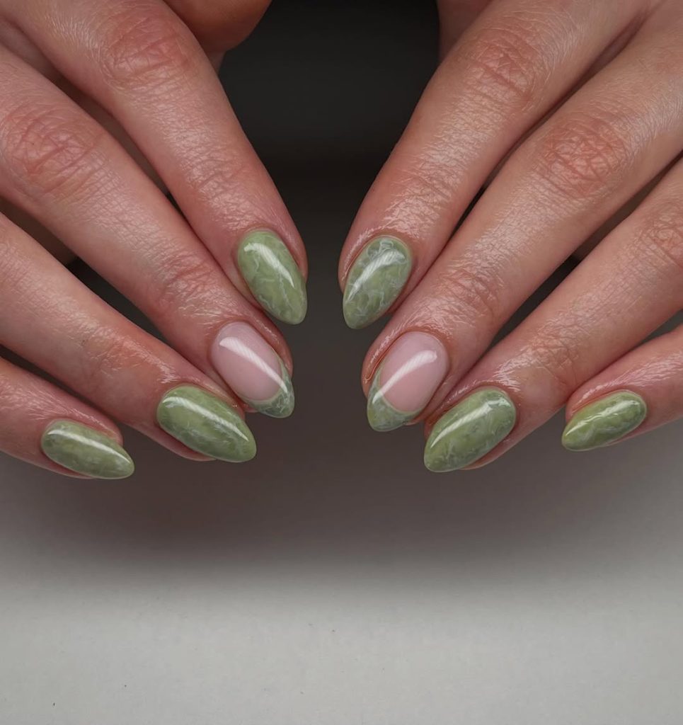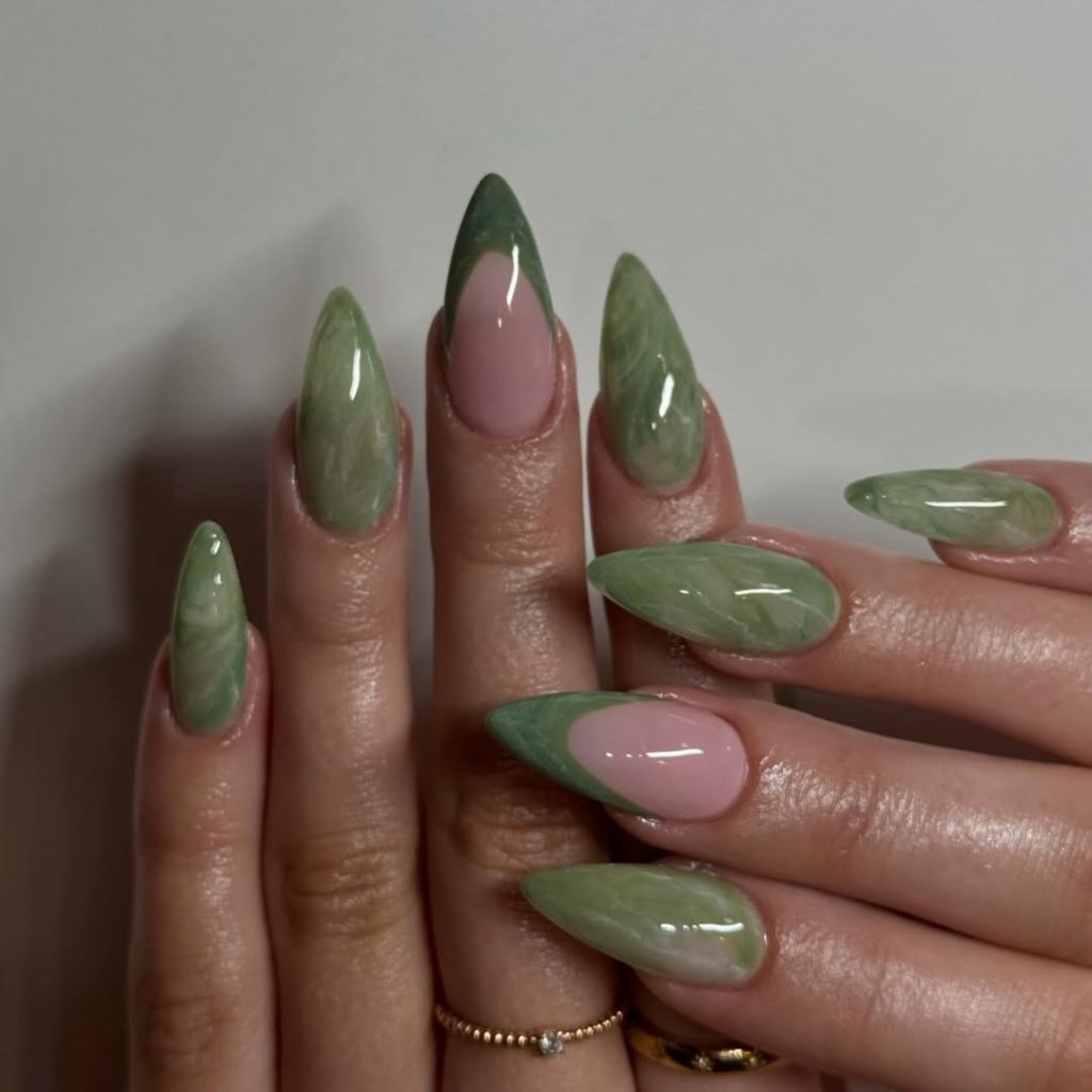 French tip jade nails add a contemporary organic vibe to a traditional approach. The light green marble tips create a lovely contrast to the natural pink base. The overall look is polished with a hint of creativity. The glass-like finish adds to the depth and glam.