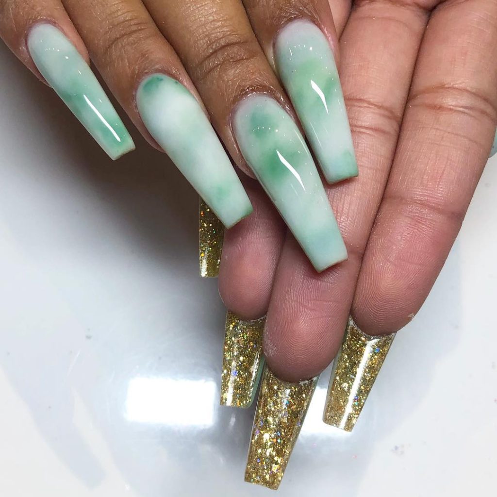Perfect for long coffin or tapered square shapes, these designs are ideal for parties or editorial looks. The glossy gel layer keeps the ombre effect seamless, while the gold glitter adds that extra drama. It’s a luxurious inspo for those who want jade tones with full-on glam energy.