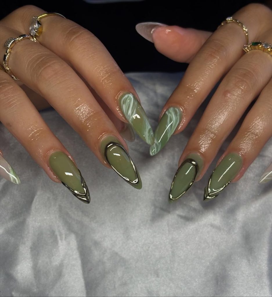 These deep jade nails blend elegance with bold detail. Swirling marble tones are elegantly accented by fine gold borders that frame each nail, creating jewelry-like pieces. The movement of the layered hues captures the natural stone and evokes polished jade with a luxurious touch.