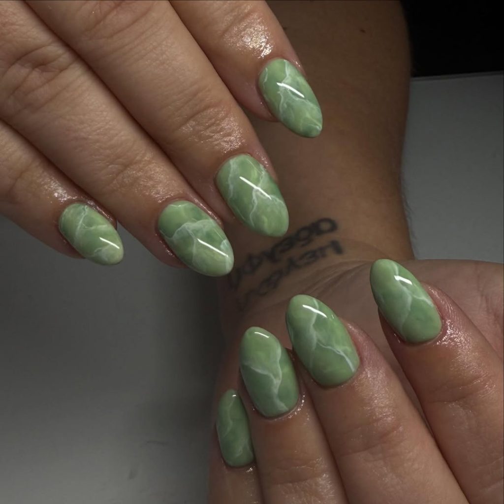 A timeless favorite, these jade marble nails feature deep green tones swirling through a translucent base for a truly natural gemstone effect. The veins resemble authentic jade, giving off an effortlessly chic, grounded vibe—like carrying a piece of art on your fingertips.
