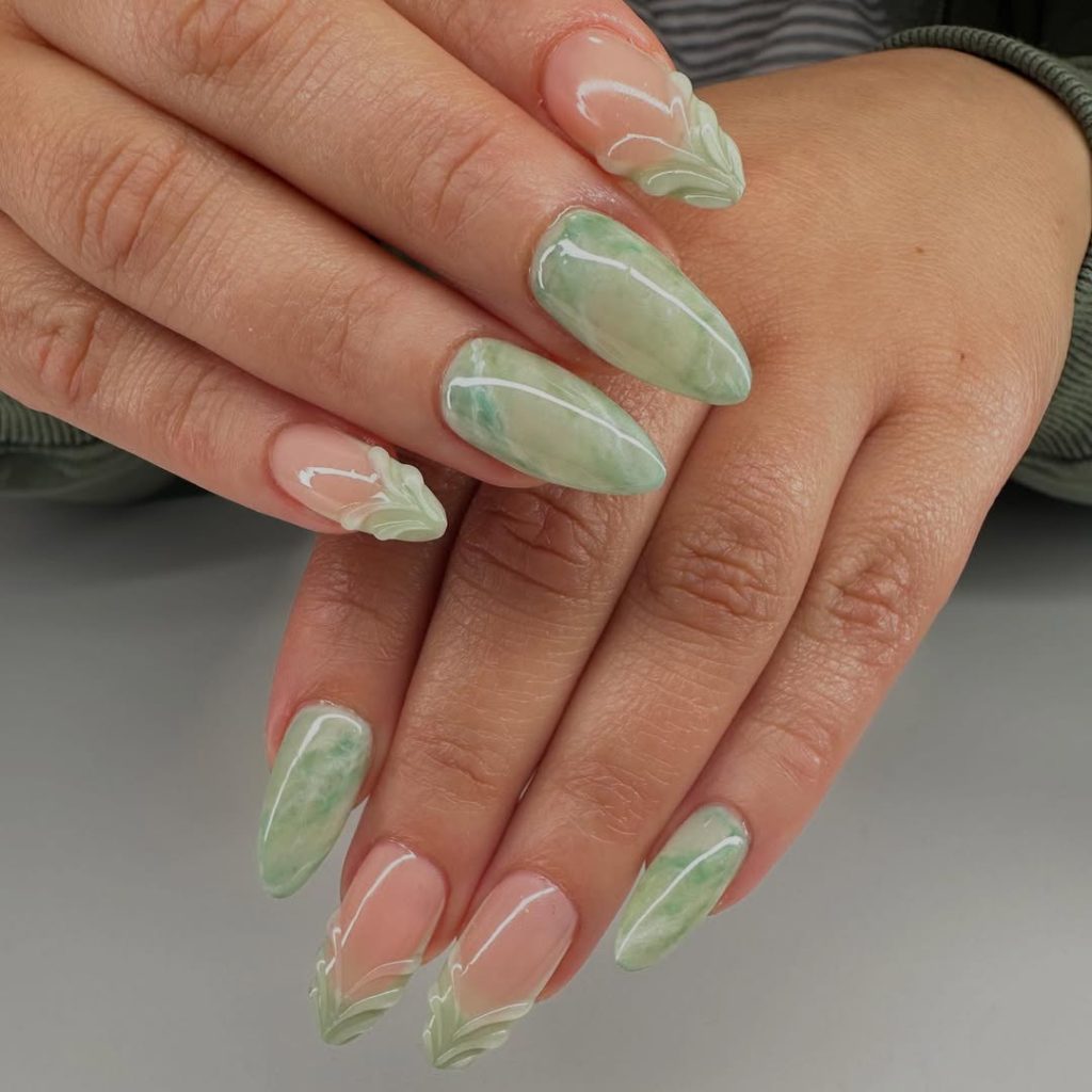 A modern take on natural beauty, these jade nails feature soft marble patterns with leaf-shaped white tips that mimic carved stone petals. The mix of green and neutral tones makes them feel fresh, light, and perfectly in tune with the 2026 minimalist nail trend.