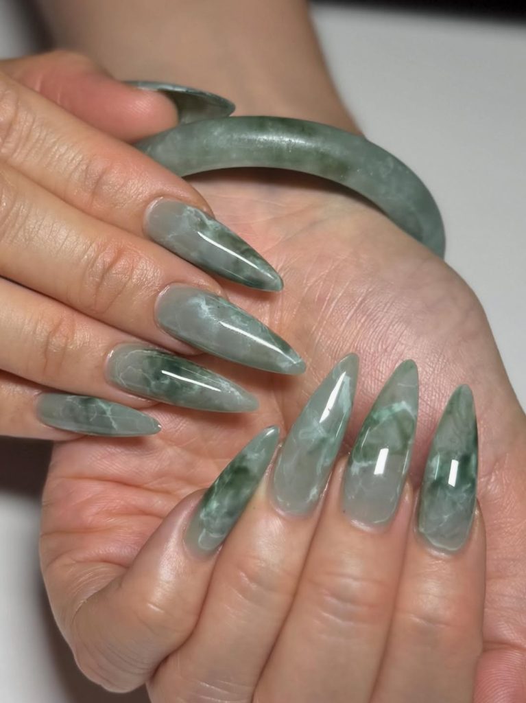 If dramatic elegance speaks to you, these long stiletto jade nails are pure art. Their dark green marbling blends into soft gradients, creating an illusion of depth similar to genuine gemstone veins. The glassy finish enhances the mystical vibe, making each finger look like a polished piece of carved jade jewelry.