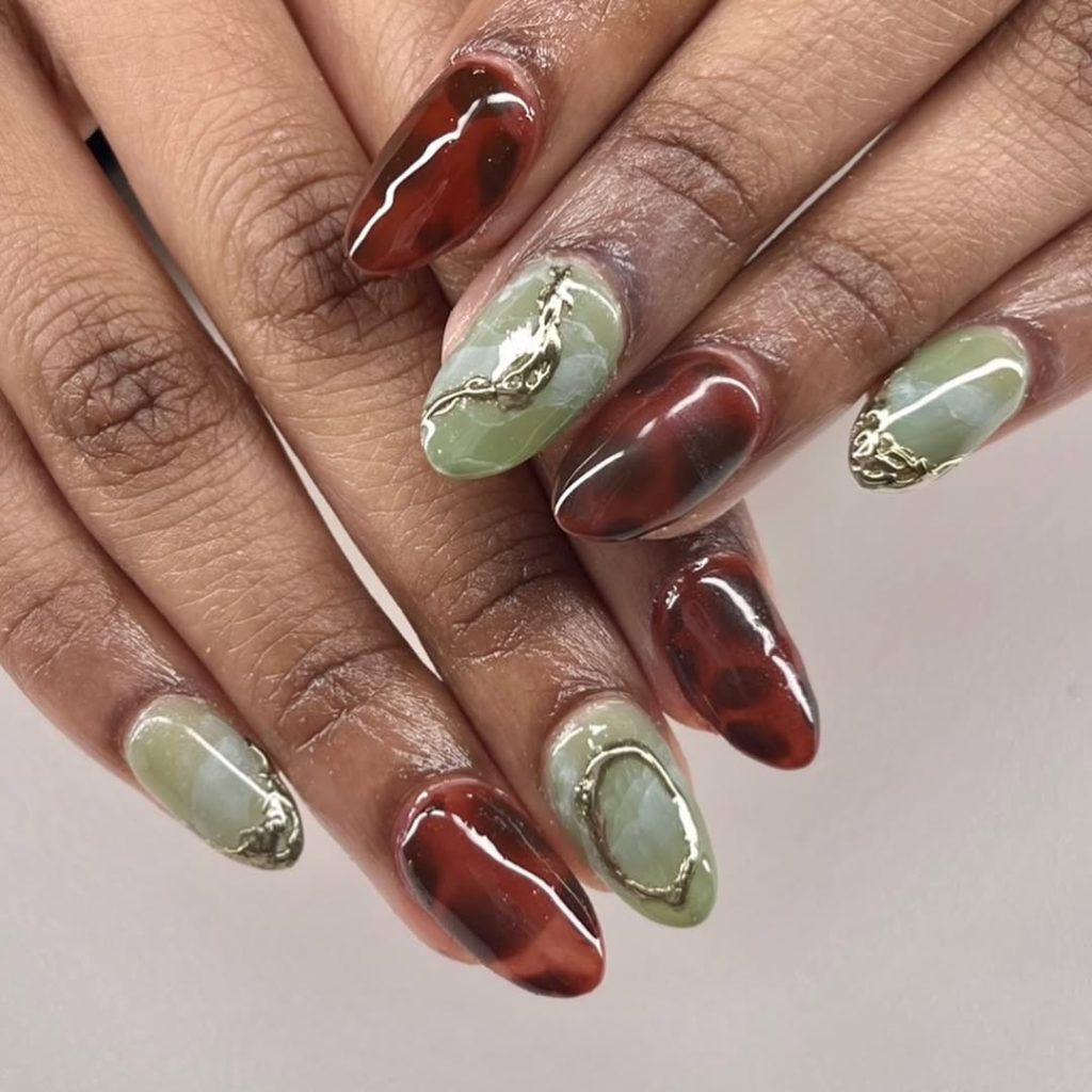 These gel nails flatter all skin tones and look best on almond or oval shapes. The gold accents create a regal yet modern aura, balancing warmth and sophistication. Pair them with red lipstick or a dark outfit to emphasize their jewel-toned drama and artistic texture—ideal for evening or holiday looks.