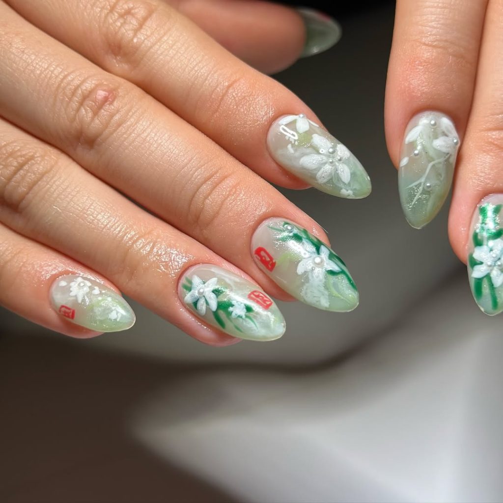 This delicate manicure captures the essence of traditional Chinese art with hand-painted white flowers and subtle green jade marbling. The soft shimmer and intricate floral lines give it an ethereal, almost painted-on quality, perfect for those who appreciate beauty with cultural depth and storytelling.