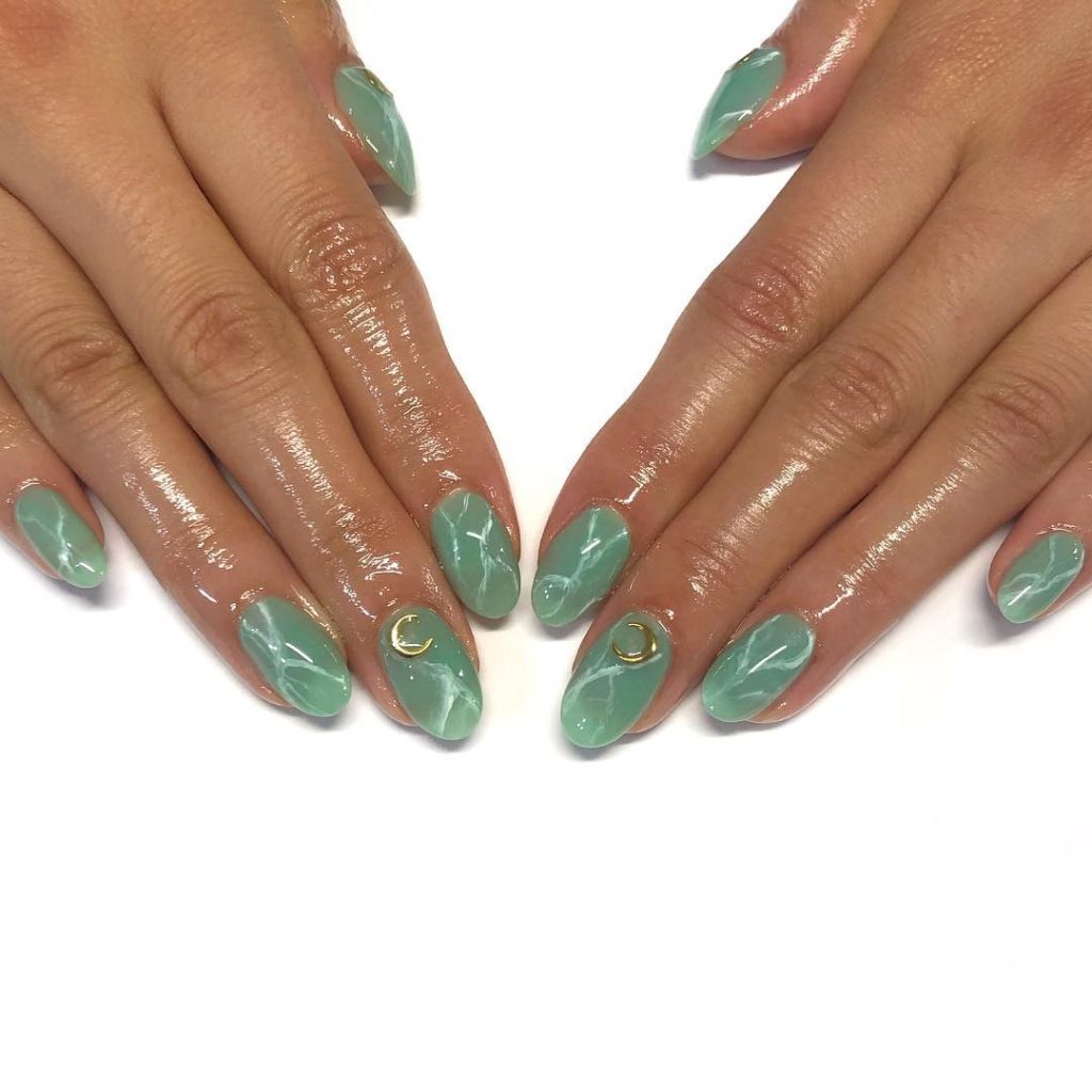 The mint jade nails are a source of inspiration—soft, bright, and balanced with a subtle marble texture. The small gold and white moon charms provide a heavenly touch, enhancing the beauty of the calming pastel green color. The design resembles the light of spring sealed in a gemstone.