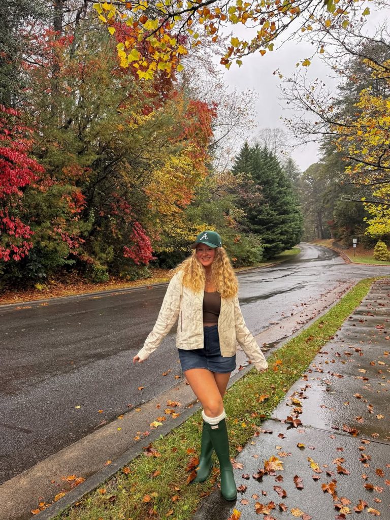 The vibe here is what makes it stand out: relaxed, happy, and easy to move in. The rain boots make it practical for wet grounds, while the mini skirt keeps it youthful and light. This is great inspo for women looking for ideas that feel fresh, playful, and perfect for transitional fall and spring weather.